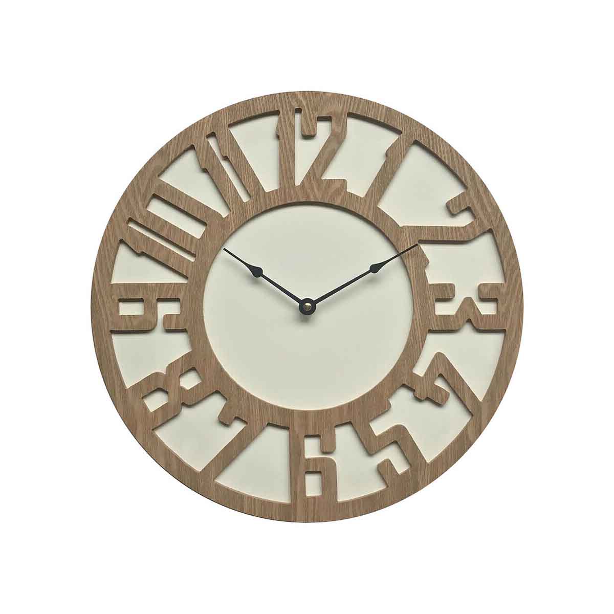 The Vitus wall clock is mounted on a crisp white background that emphasises the natural colouring and dark grain of the face. Its numbers are integrated into the face to give the clock a flowing look. Traditional black spade minute and hour hands are attached to the central section by a gold coloured nut.