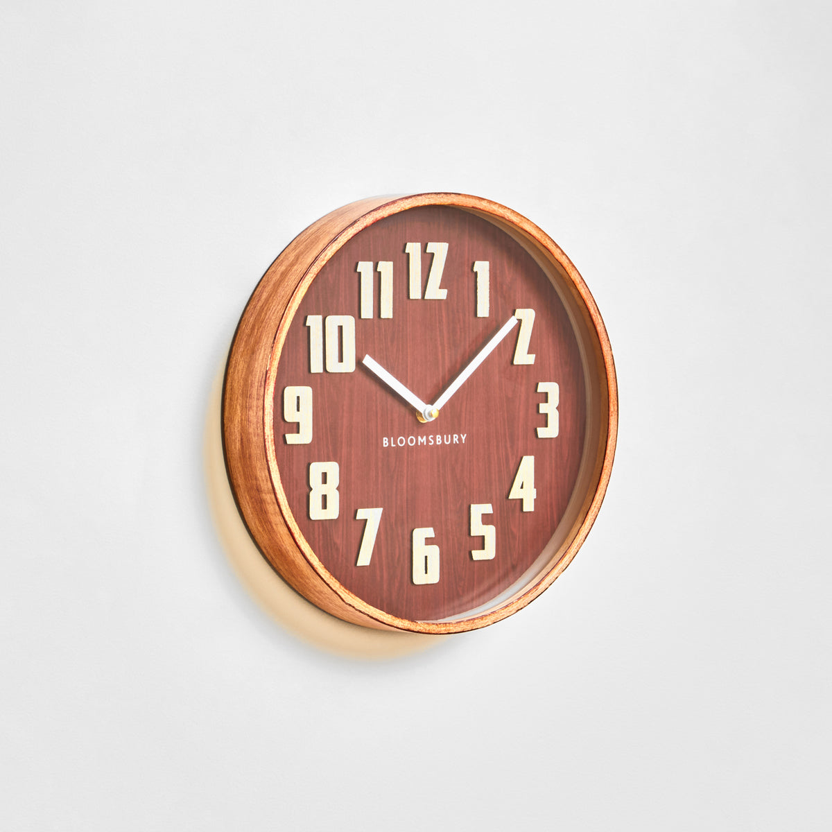 The round case is made from natural wood and has a red finish that blends in with the dials darker tone. The large numbers are coloured white and have an aesthetic that evokes 1970s chic. Its minimal white hands are easy to read. White text stating Bloomsbury is displayed beneath the hands, and a clear glass pane covers the dial.