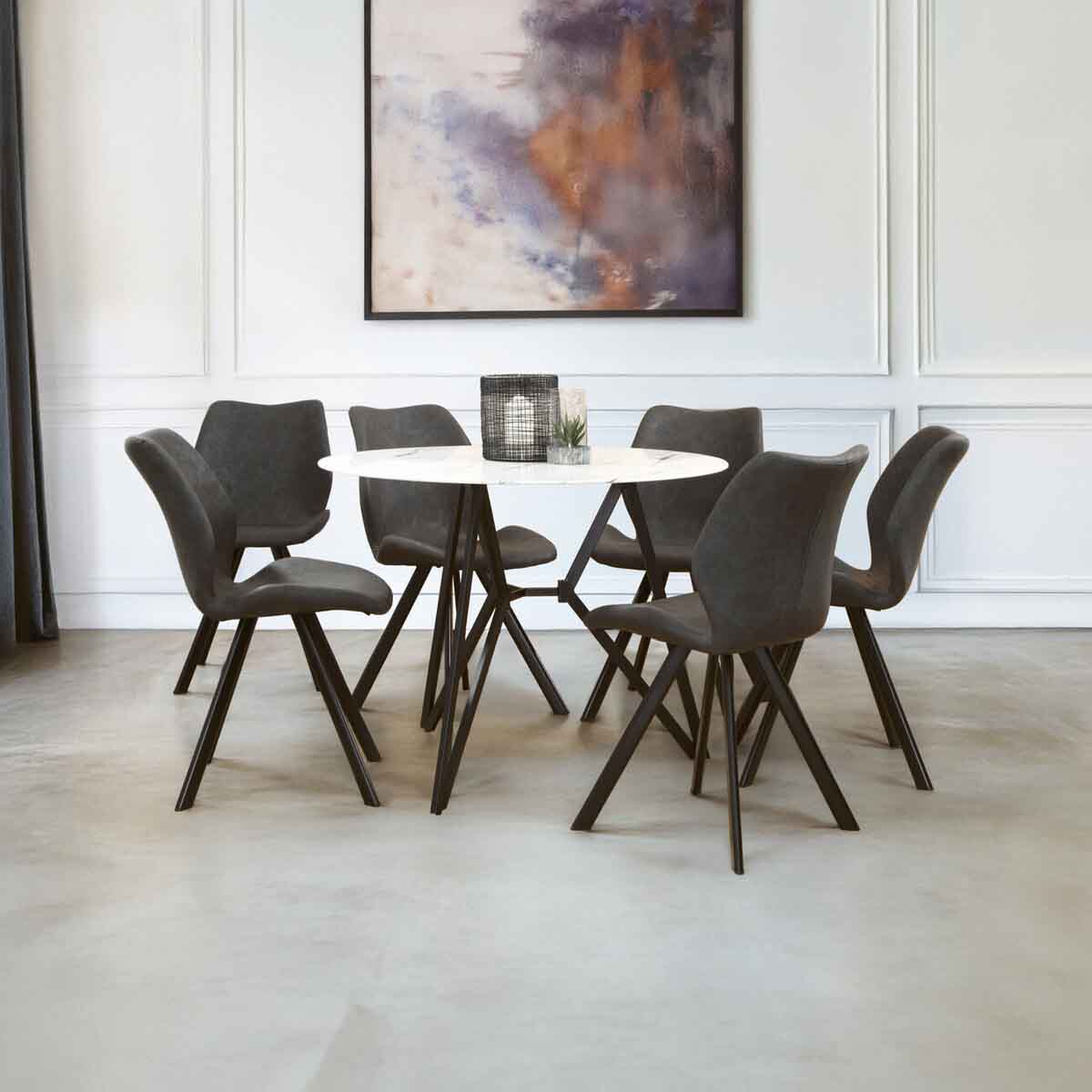 This 7pc dining set features a round table with a white marble top that contrast the sleek hairpin legs. Each chair has a dark grey curved back complemented with black finish angular legs that further the sophistication.