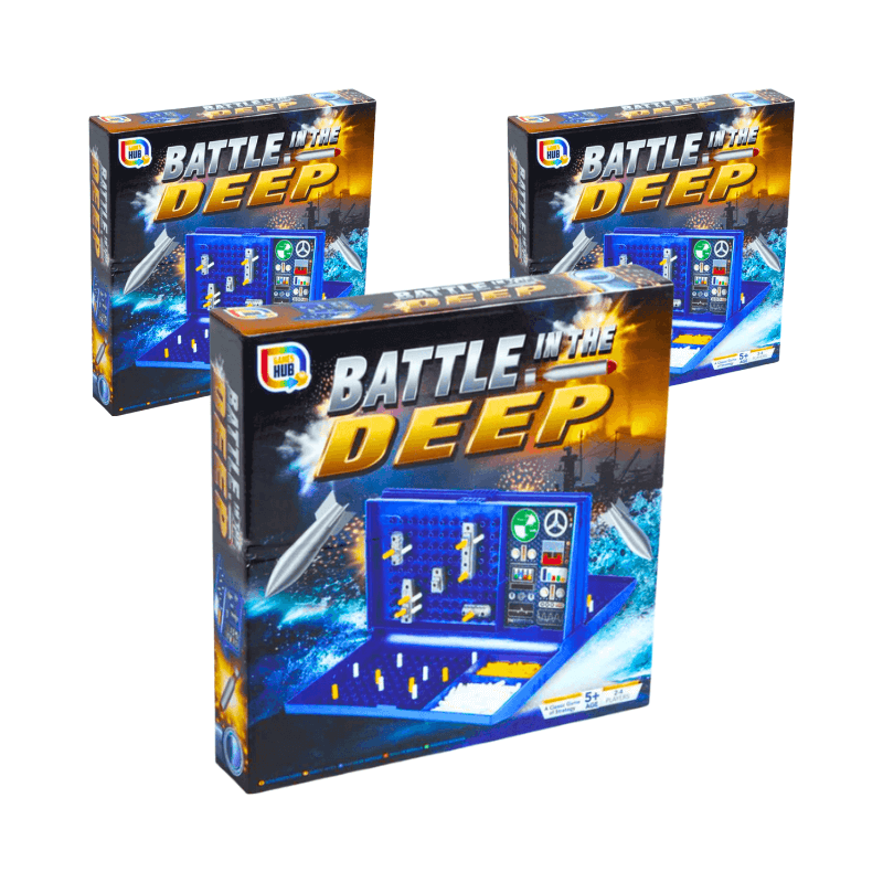 Sink your family's boredom with Battle In The Deep, a quirky and fun twist on the classic Battleship game. Navigate the uncharted waters and outsmart your opponents with this family board game. Perfect for a night in with the crew, no experience required. Ahoy!