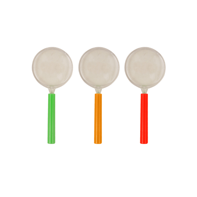 The Wholesale Mini Magnifying Glass - (CDU of 96) is no ordinary lens. Get a crystal-clear view of the world around you with several times the clarity. Whether you're a detective, a scientist, or just a nosey neighbour, this powerful glass will be your trusty sidekick in all your investigations! 11cm in size and 3 different coloured handles. Ideal for party bags. Age 3+ Bring your close-up game to the next level with this pocket-sized powerhouse. See details you never even knew existed and get ready to get to the bottom of all the mysteries. With a few flicks of your wrist, you'll be an intrepid investigator with your own Mini Magnifying Glass!