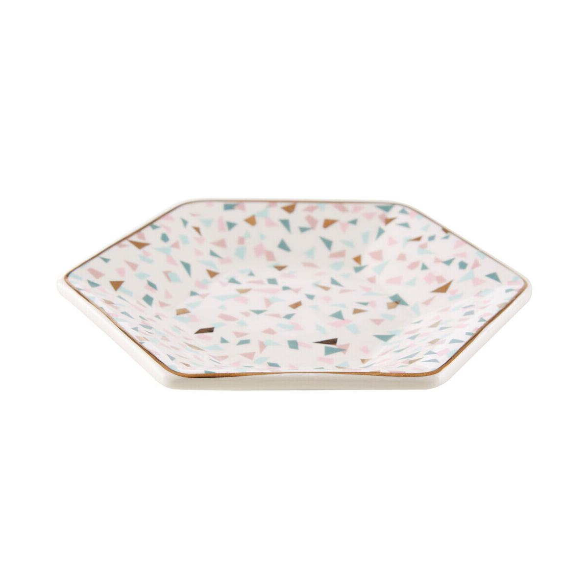 Made using dolomite, this large hexagonal plate with raised sides will bring geometric accent to the dining table. Featuring a gold finish rim, it boasts a minimal luxurious appeal while contrasting with its muted base and terrazzo pattern in assorted colours.