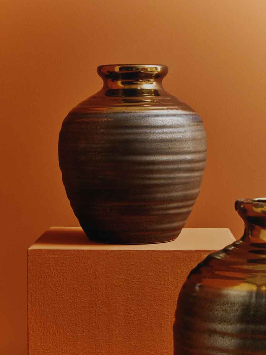Skilfully handcrafted, the coppershaded surface is enhanced expertly by the warm metallic detail around the neck of this vase. This small ceramic vase creates a rustic appeal to a variety of abodes, and the ribbed detail adds texture to it.