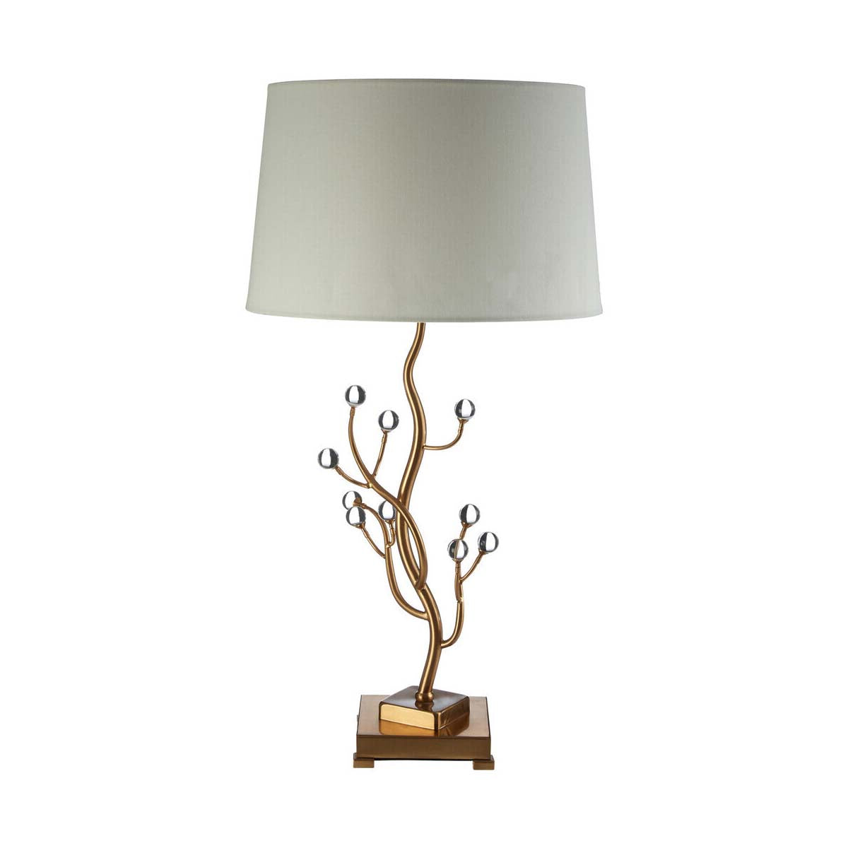The Zeva table lamp takes its form from nature, with an undulating design and branch-like forms sprouting outward. The end of each branch form boasts a clear crystal that enhances the lamps elegance and understated luxury. Created from smooth iron the lamp features a rich gold finish that creates a striking counterpoint to the crisp white linen shade.